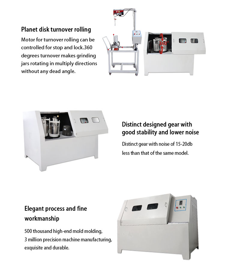 Heavy-duty full-directional planetary ball mill is widely used in geology, minerals, metallurgy, electronics, building materials, ceramics, chemical industry, light industry, medicine, environmental protection and other departments. It is suitable for lots of production fields such as electronic ceramics, structural ceramics, magnetic materials, lithium cobalt oxide, lithium manganate, catalyst, phosphor, long afterglow phosphor, rare earth polishing powder, electronic glass, etc. Production of Powder, Fuel Cell, Zinc Oxide Varistor, Piezoelectric Ceramics, Nanomaterials, Wafer Ceramic Capacitance, MLCC, Thermistor (PTC, NTC), ZnO Varistor, Dielectric Ceramics, Alumina Ceramics, Zirconia Ceramics, Phosphor Powder, Zinc Oxide Powder, Cobalt Oxide Powder, Ni-Zn Ferrite, Mn-Zn Ferrite, etc.